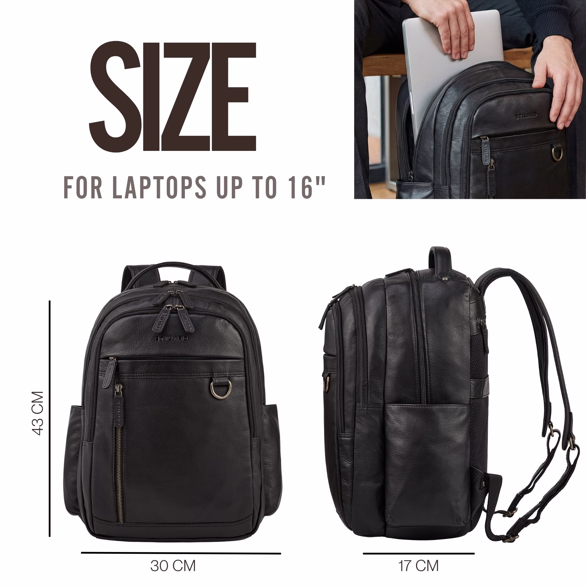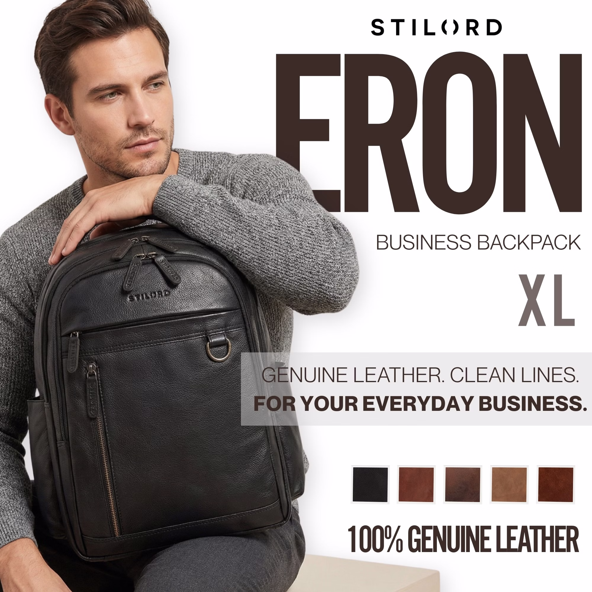 - TIMELESS. SECURE. "ERON": The men's Leather Backpack XL made from natural genuine leather impresses with its clean format of 30 x 17 x 43 cm and timeless design. As a folder backpack, it accompanies you stylishly and in an organized manner at the office, during the working day or at university.
