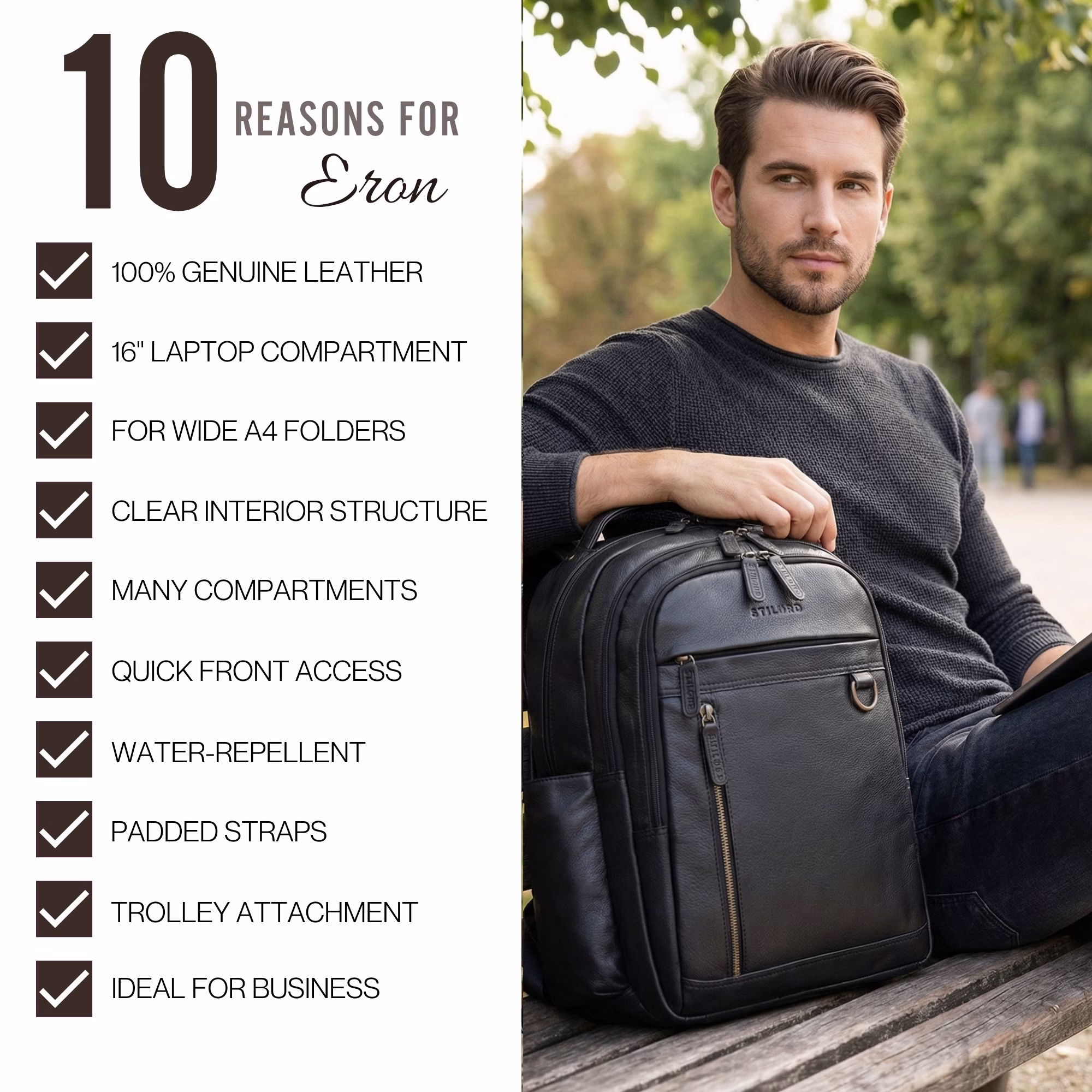 - DETAILS: Dimensions: 30 x 17 x 43 cm | Weight: 1300 g | Material: genuine leather | Model: “Eron” | Compatibility: laptop 15 | 15.6 | 16 inches, DIN A4 folders | Highlights: ample storage space, numerous compartments, anti-theft pocket, breathable back panel, trolley sleeve and padded shoulder straps.