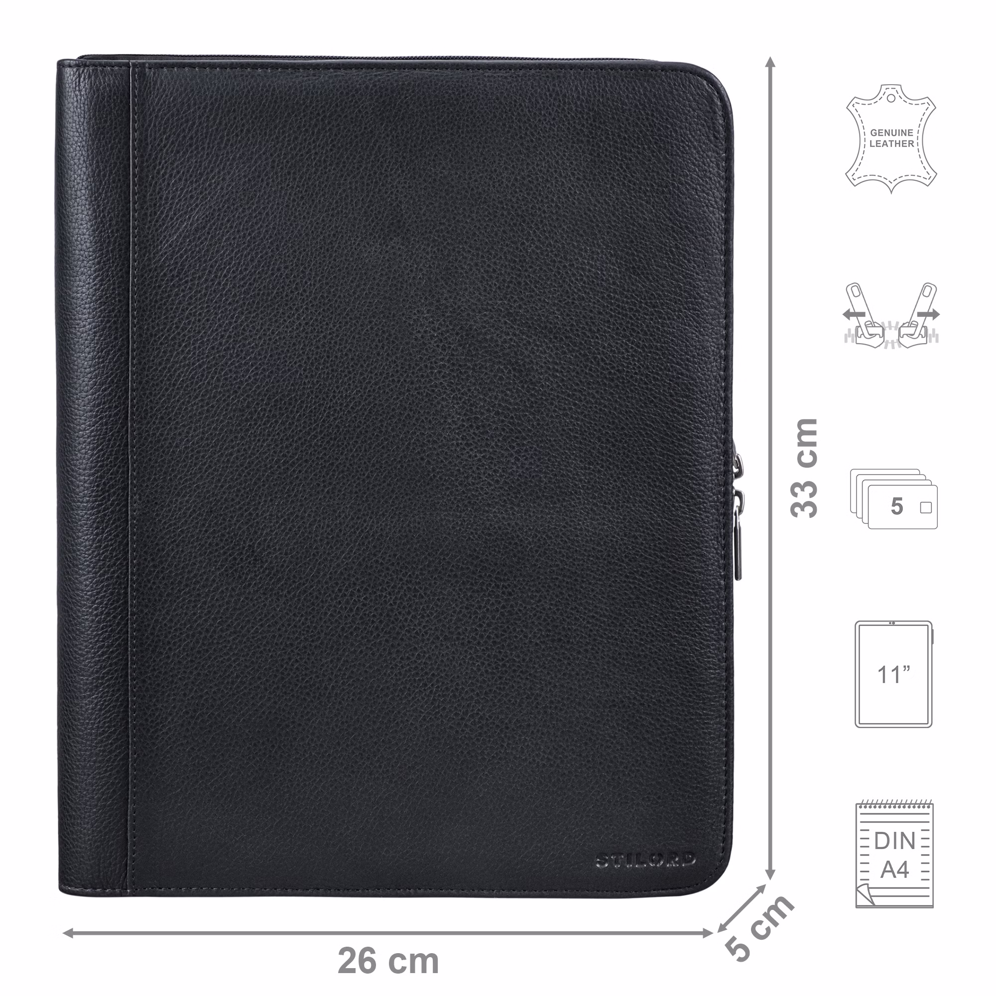 • DETAILS: Dimensions (LxWxH): approx. 26x33x5 cm | Weight: 820 grams | Model: "Tate" | Material: Genuine cowhide leather | Manufacturer: STILORD | Special features: Two-way zippers; fits DIN A4 documents | Compatibility: 11-inch tablet (unpadded, approx. 28x25 cm)