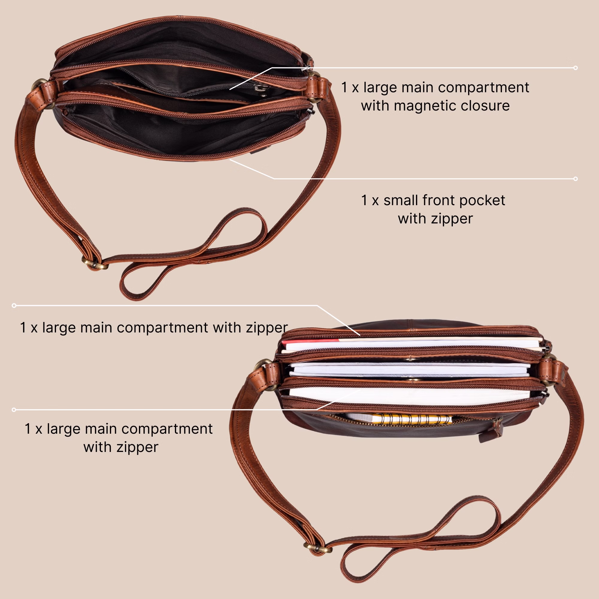 - Ubekymret gennem hverdagen: Skuldertasken i læder følger dig, så du kan skrive trygt, ubekymret og optimistisk gennem livet - Smartphone, pung, make-up, nøgler og endda DIN A5-dokumenter kan nemt opbevares her