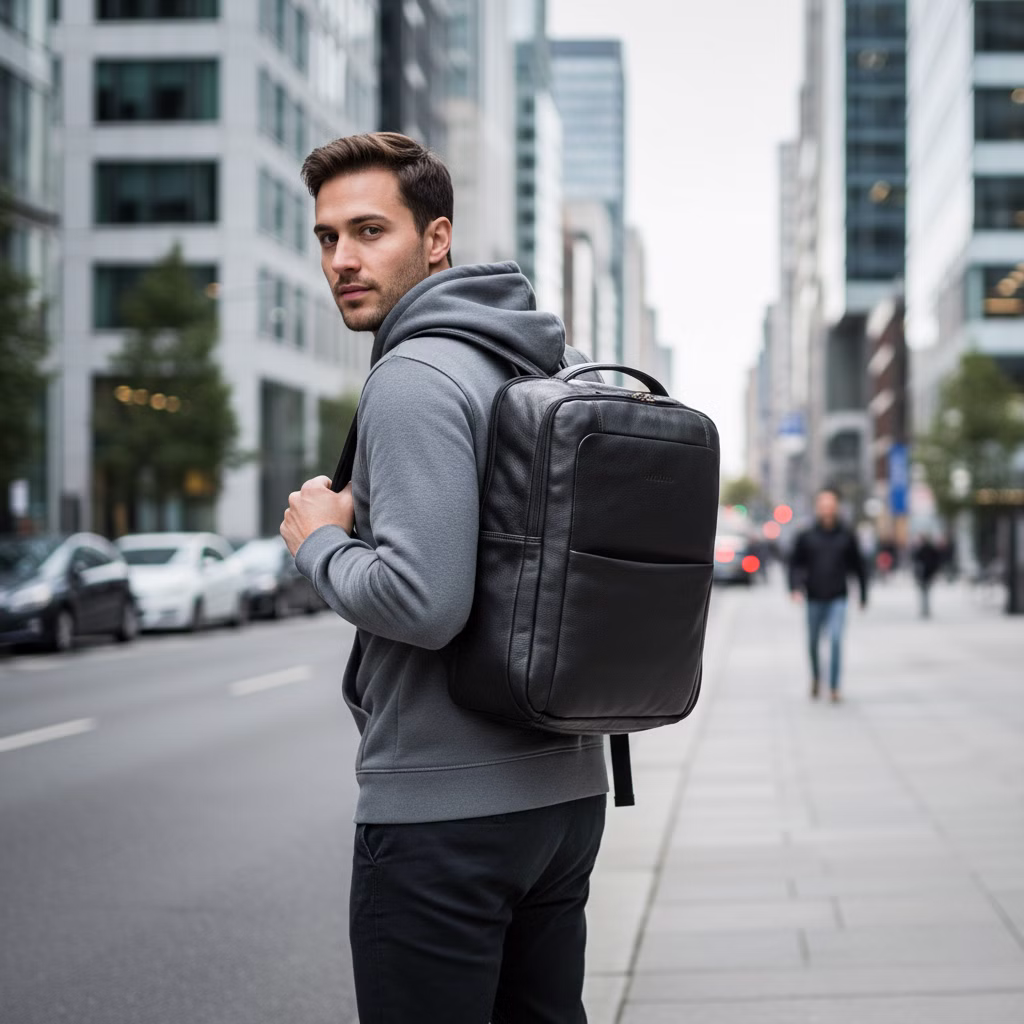 "Balduin" Large leather laptop backpack - Alle fordelene på et øjeblik: