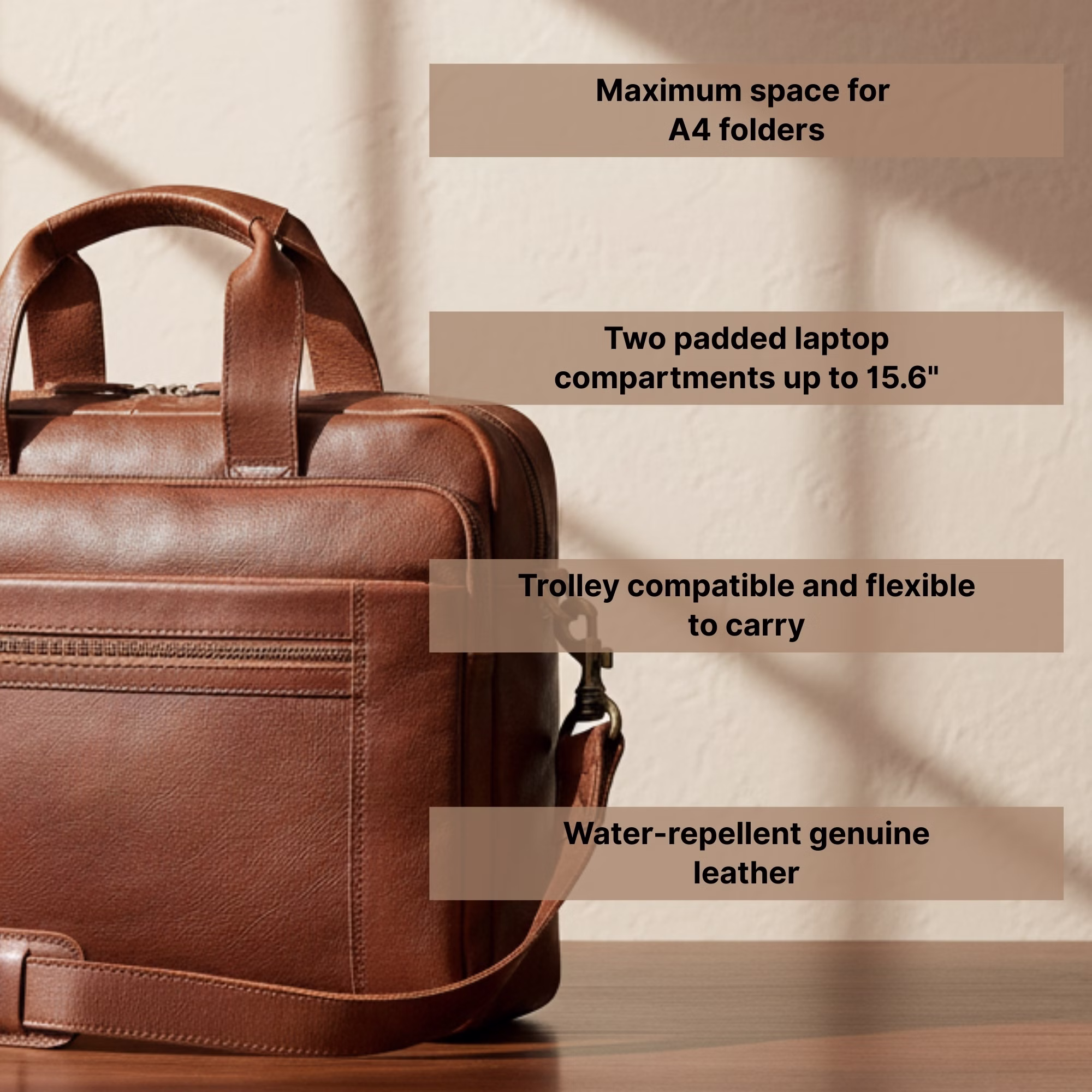 • DETAILS: Afmetingen: (LxBxH): ca. 39 x 12 x 30 cm | Gewicht: 1300 gram | Materiaal: rundleer | Compatibiliteit: Geschikt voor 15 | 15,3 en 15,6 inch laptop en Macbook (max. 37 x 27 cm), brede DIN A4-ordner