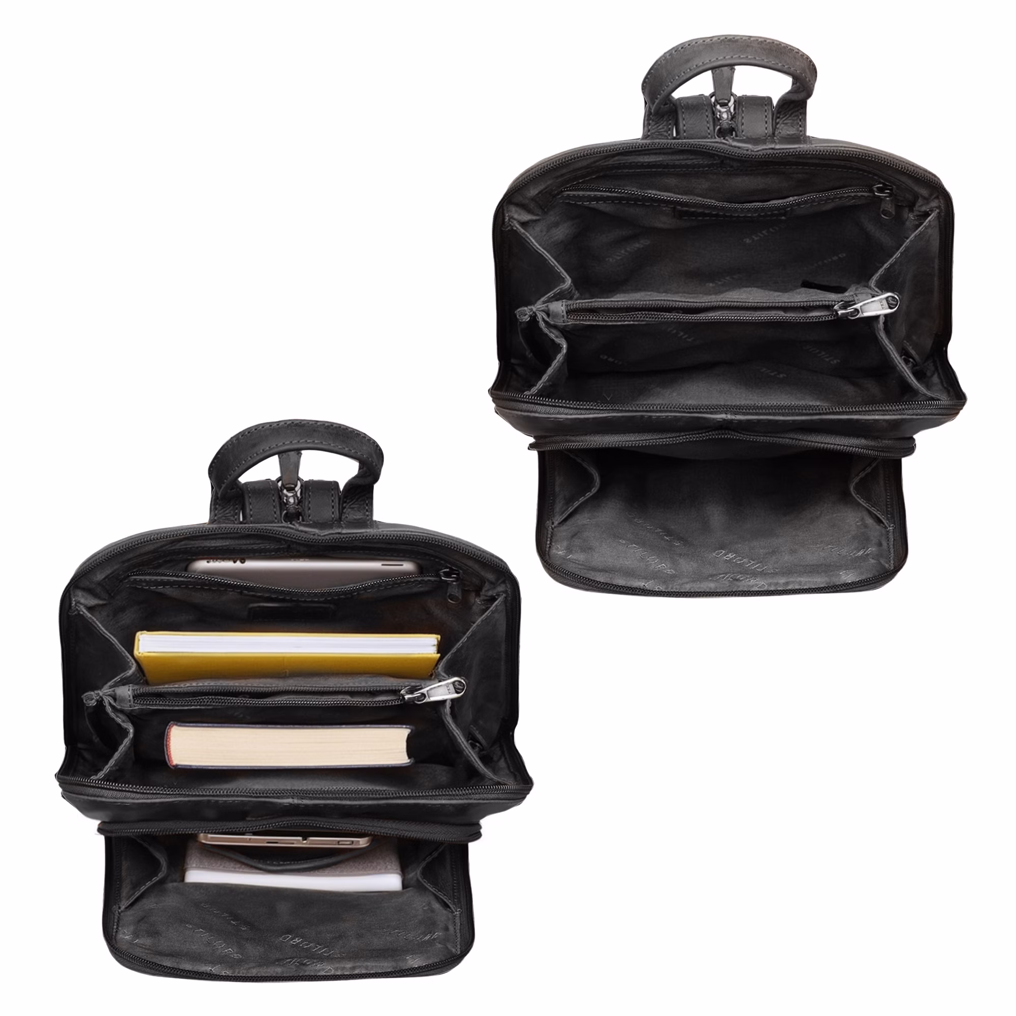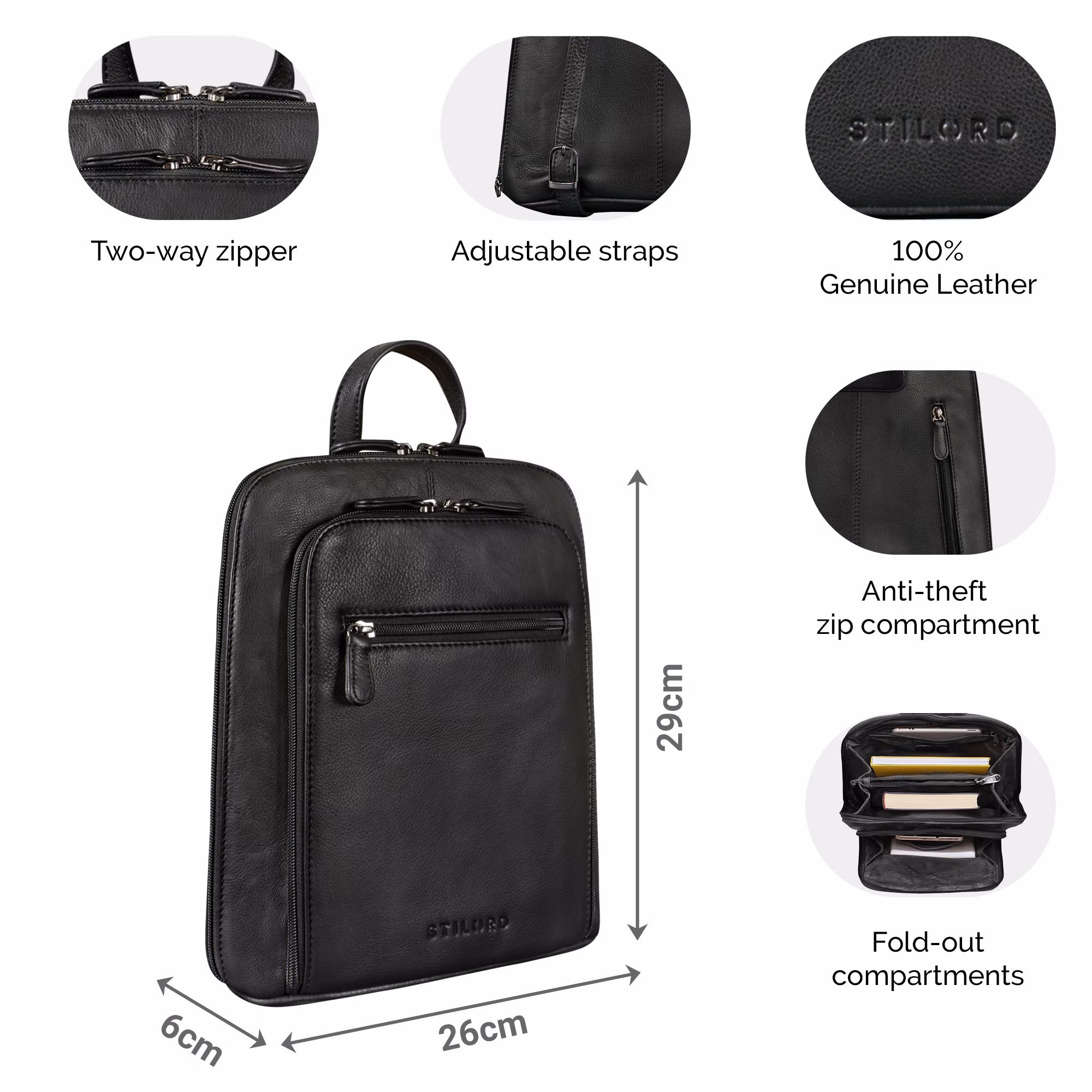 - Dubbele ritssluiting: maakt het snel en eenvoudig openen van uw compacte rugzak leer en opbergen van spullen mogelijk.