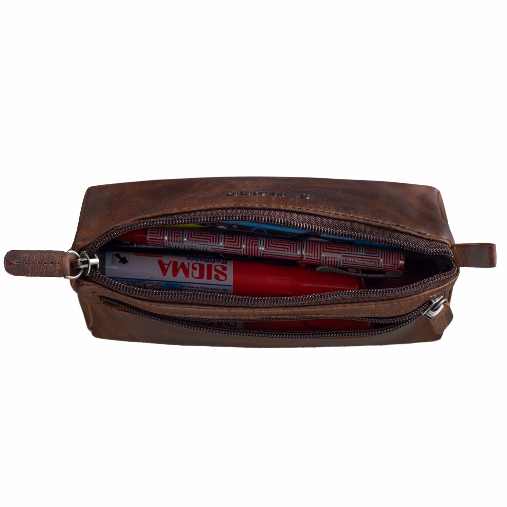 • Vaše písacie potreby: Kulaté puzdro na ceruzky má 2 priehradky na zips, do ktorých môžete mimoriadne prehľadne uložiť perá, pravítka, zvýrazňovače, štetce a kresliace potreby. Naše kožené puzdro je ideálne nielen ako puzdro na ceruzky a peračník, ale je obľúbené aj ako kozmetický kufrík.