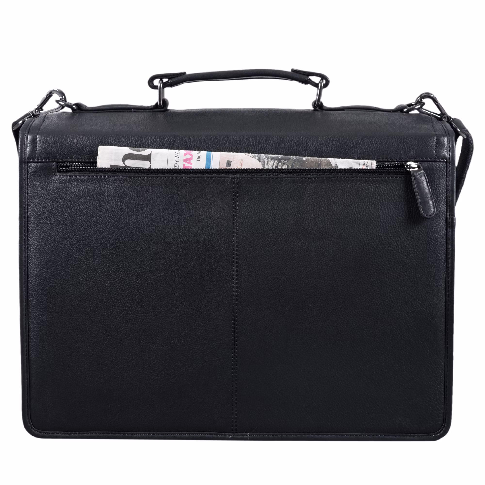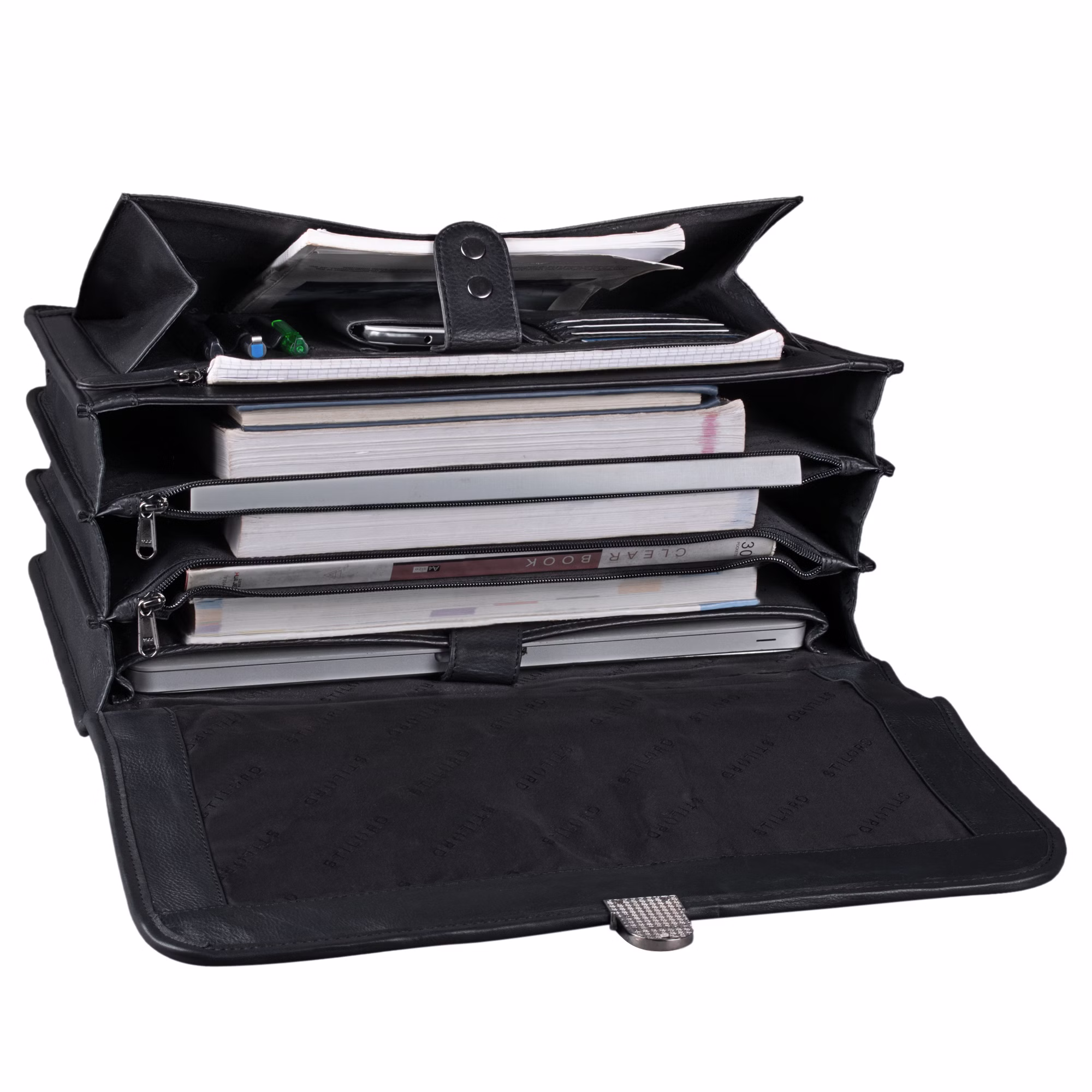 In addition to high-quality genuine leather, the business briefcase also impresses with practical storage options: The large main compartment with triple divider and laptop compartment offers space for 14 inch notebooks, a narrow DIN A4 folder and books.